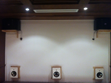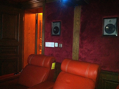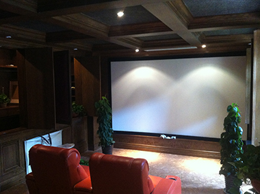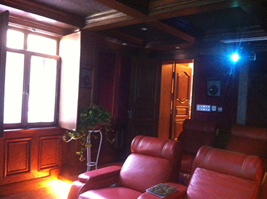 視聽室150寸弧形透聲幕布,隱藏在透聲幕布后的主音響、環(huán)繞音響及卡拉OK音響。Control4中控及后環(huán)繞音響,背景音樂系統(tǒng)戶外花園全天候假山喇叭。