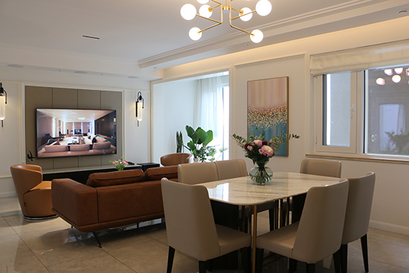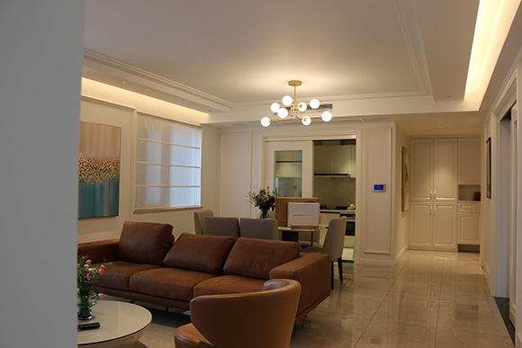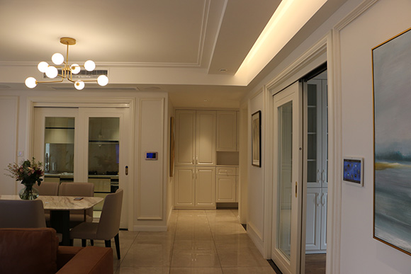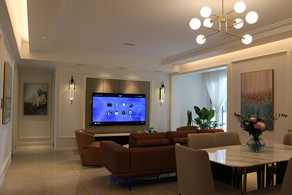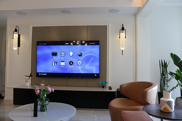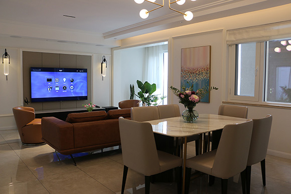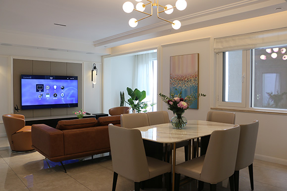 項(xiàng)目以全宅智能化的方式來設(shè)計(jì)這個(gè)展廳,采用美國Control4總線控制系統(tǒng),?EA-5作為控制主機(jī),配合Control4總線玻璃場景面板,來搭建整個(gè)智能家居控制系統(tǒng)。入戶、客廳、餐廳、書房、主臥室、次臥室、兒童房、廚房八個(gè)區(qū)域的智能控制。