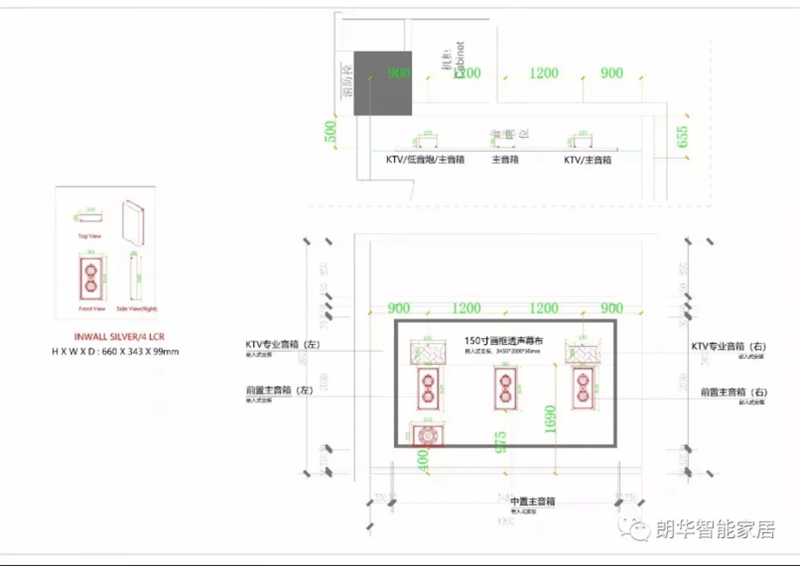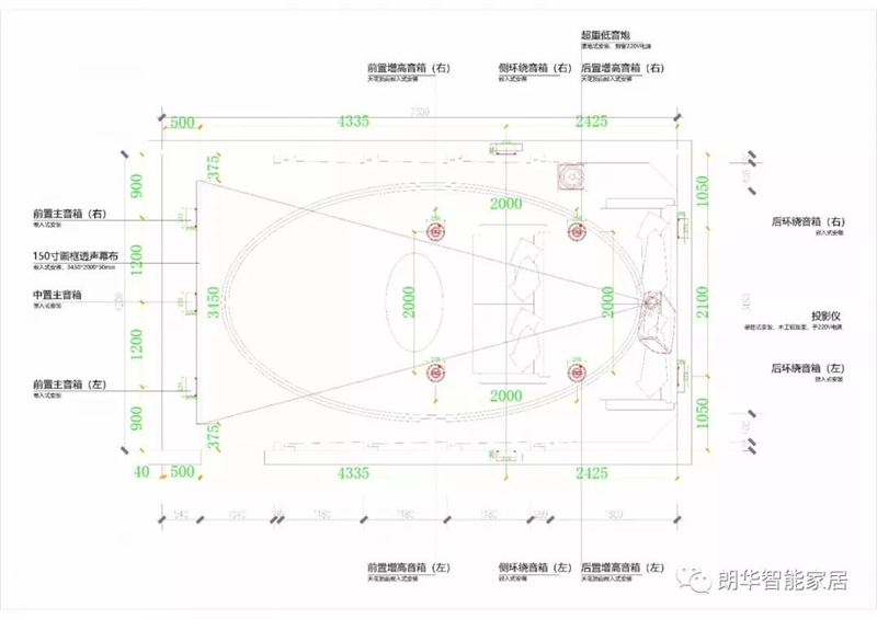 整個影視廳是嚴(yán)格按照7.2.4杜比全景聲標(biāo)準(zhǔn)進(jìn)行設(shè)計的,對音箱設(shè)備擺位有著標(biāo)準(zhǔn),主音箱、側(cè)環(huán)繞、后環(huán)繞、天花環(huán)繞揚(yáng)聲器的位置,夾角的角度,人觀看距離,以及幕布觀看的夾角等。