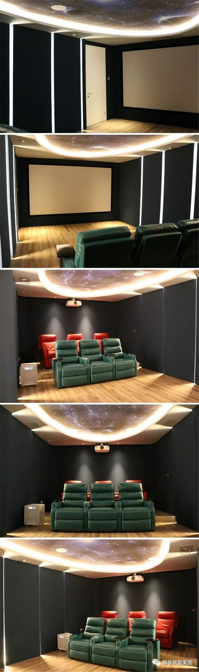 在設(shè)計之初,設(shè)計師便考慮到對于隔音和影院視聽效果的雙重要求,在設(shè)計和施工過程中將兩者完美平衡。專注做影院的都知道建筑聲學(xué)常識,重體實墻隔音效果最佳,二次紅磚墻高達(dá)53db的隔音量,尤其是對低頻的隔音最為顯著。首先我們先是做了房間結(jié)構(gòu)的改造,地面懸浮隔音的施工,解決固體撞擊聲,打造一個房中房結(jié)構(gòu)。