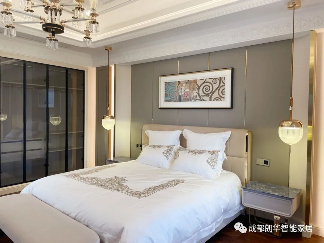 業(yè)主家里客廳、餐廳、主臥室的窗簾全部是智能控制的,設(shè)計(jì)師設(shè)置成日落后兩個(gè)臥室窗簾自動(dòng)關(guān)閉,早上按“晨起”時(shí),臥室布簾輕輕打開,在任何地方,家中的所有窗簾都可以通過墻面開關(guān)、觸摸屏或是手機(jī)來控制。
